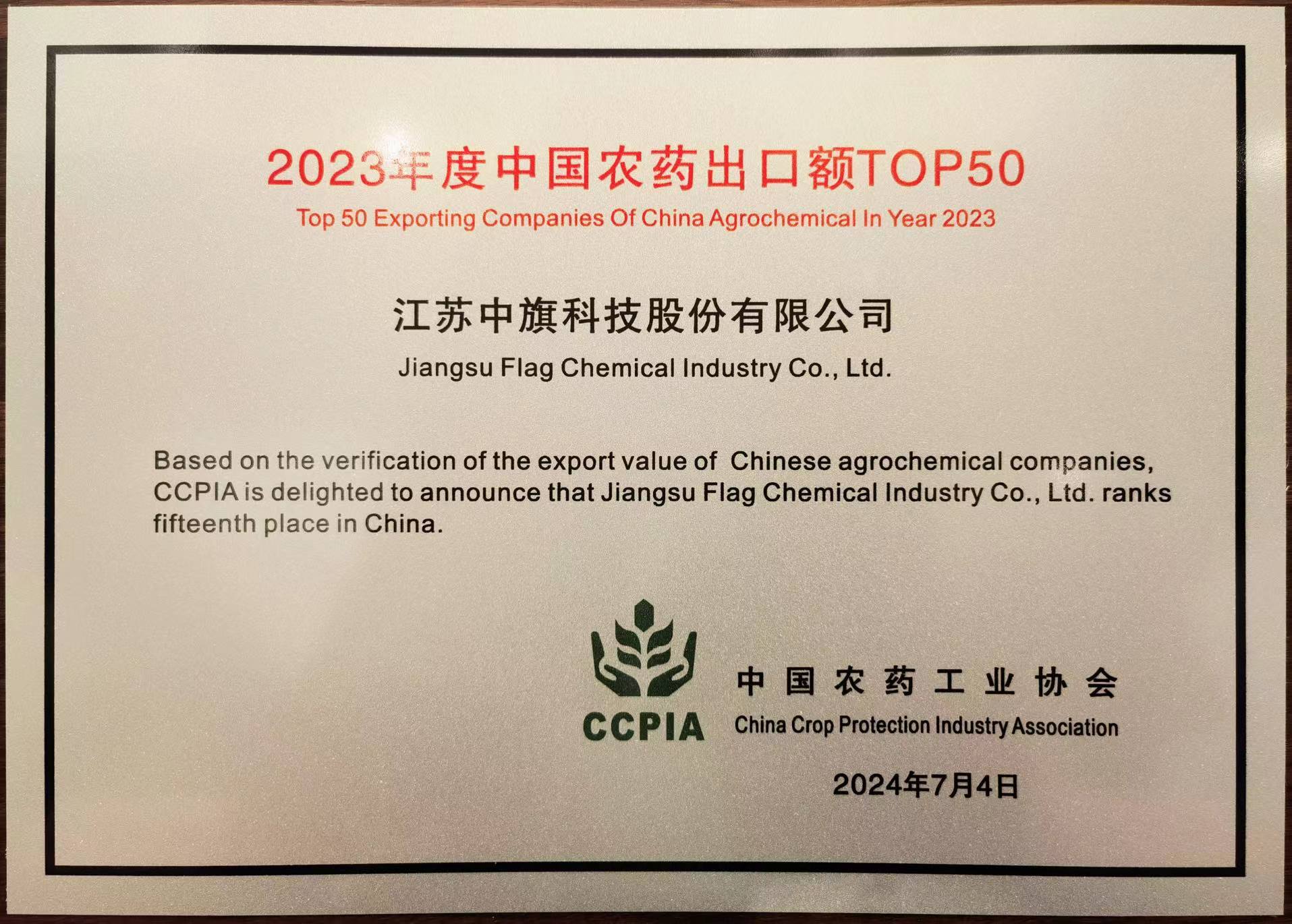 中旗榮獲2023年度“中國農藥出口額TOP50”榜第15名